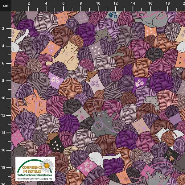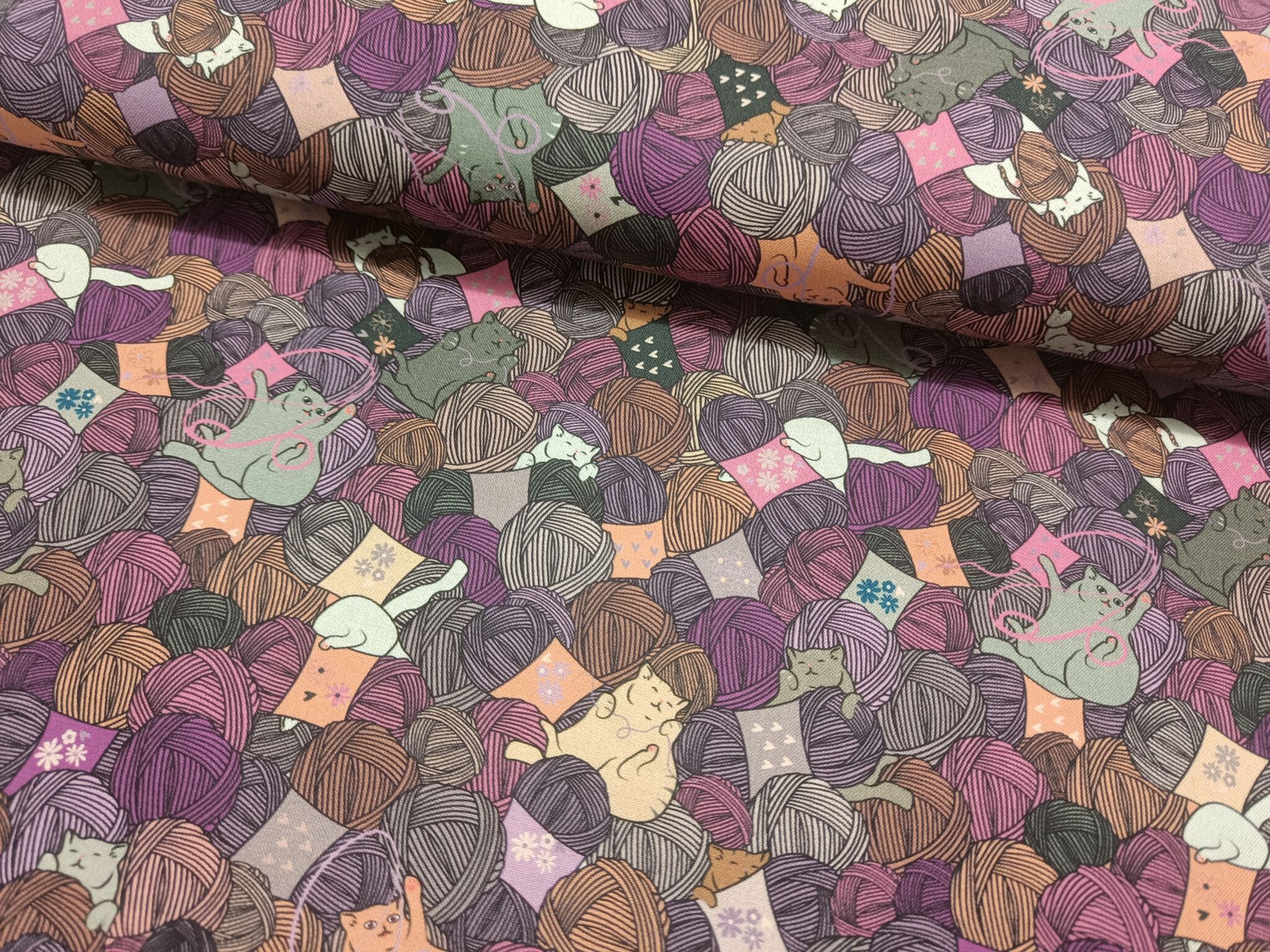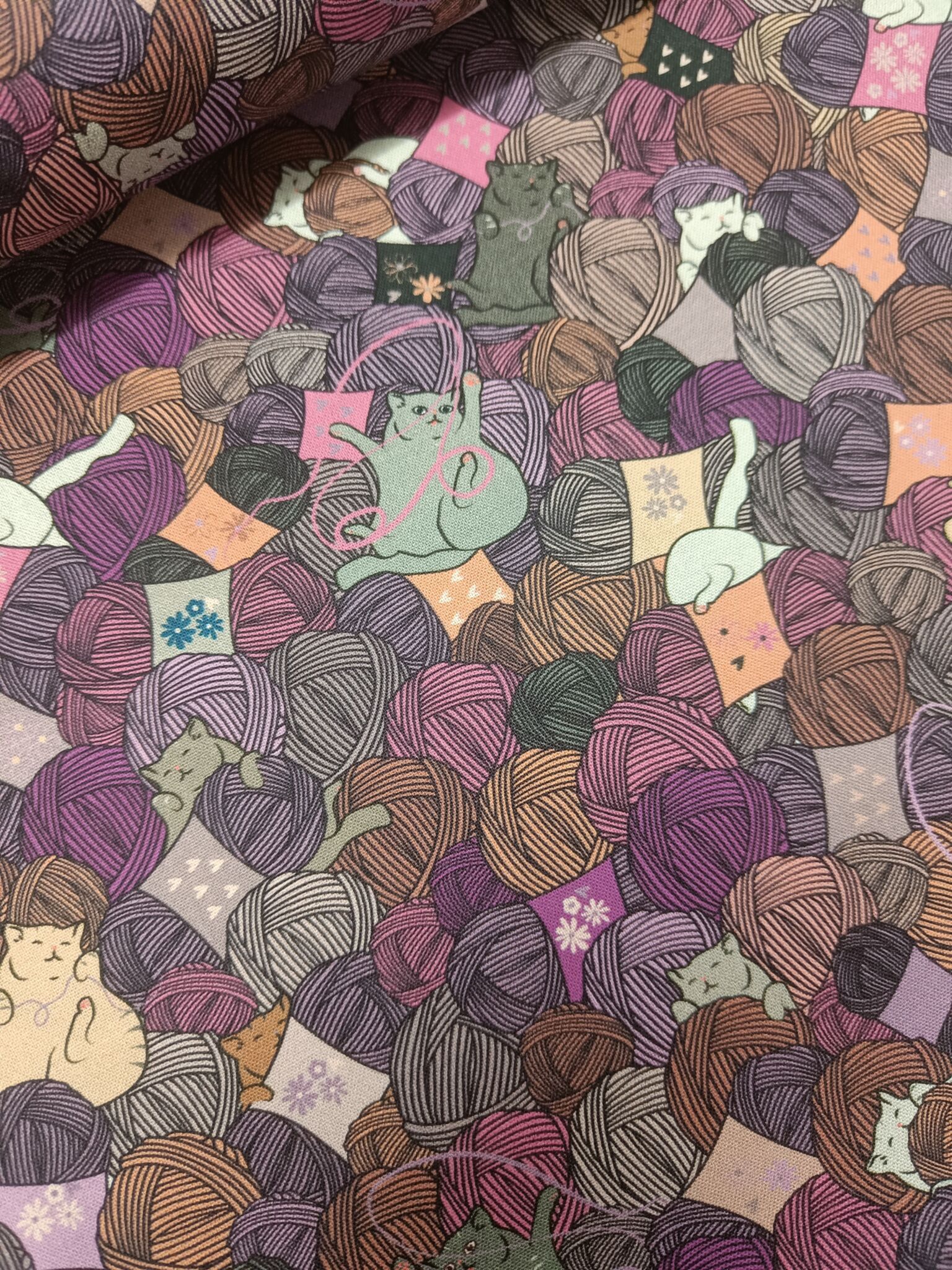 100% fast bomuld, lilla med katte og garnnøgler på.