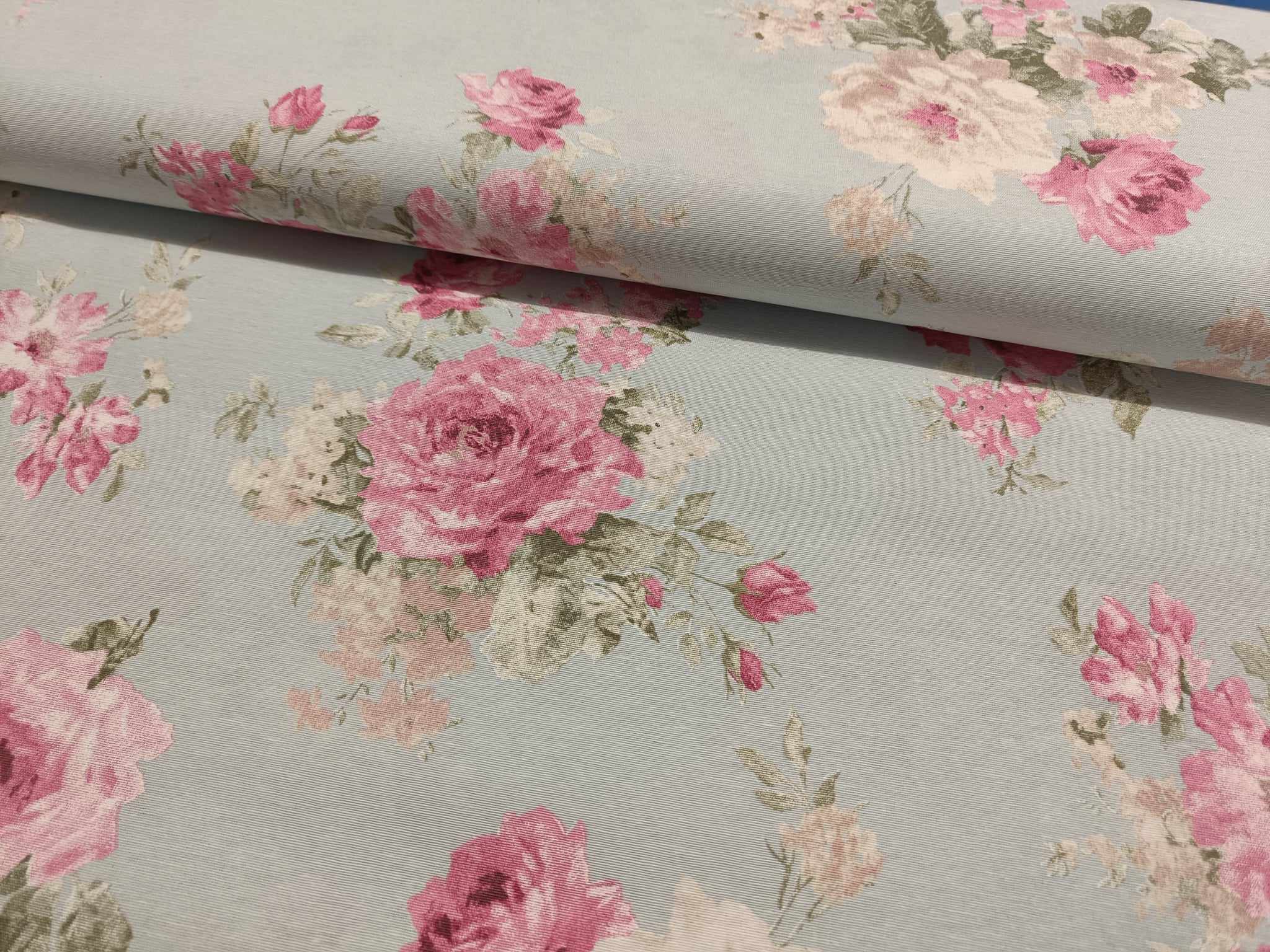 DEKO – STORE LYSERØDE BLOMSTER PÅ MINT BLÅ BUND