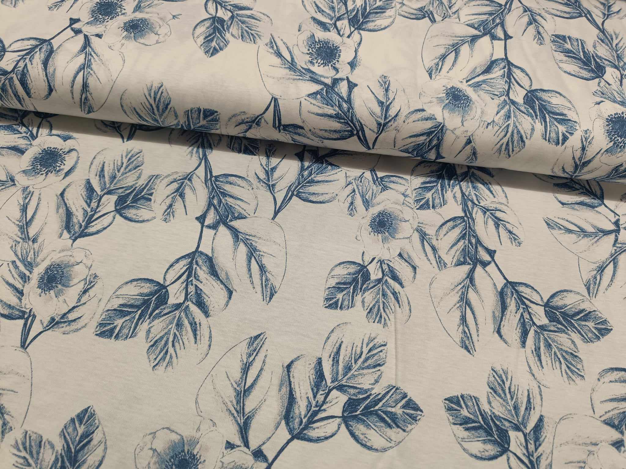 BOMULDSJERSEY – BLÅ BLOMSTER PÅ HVID BUND