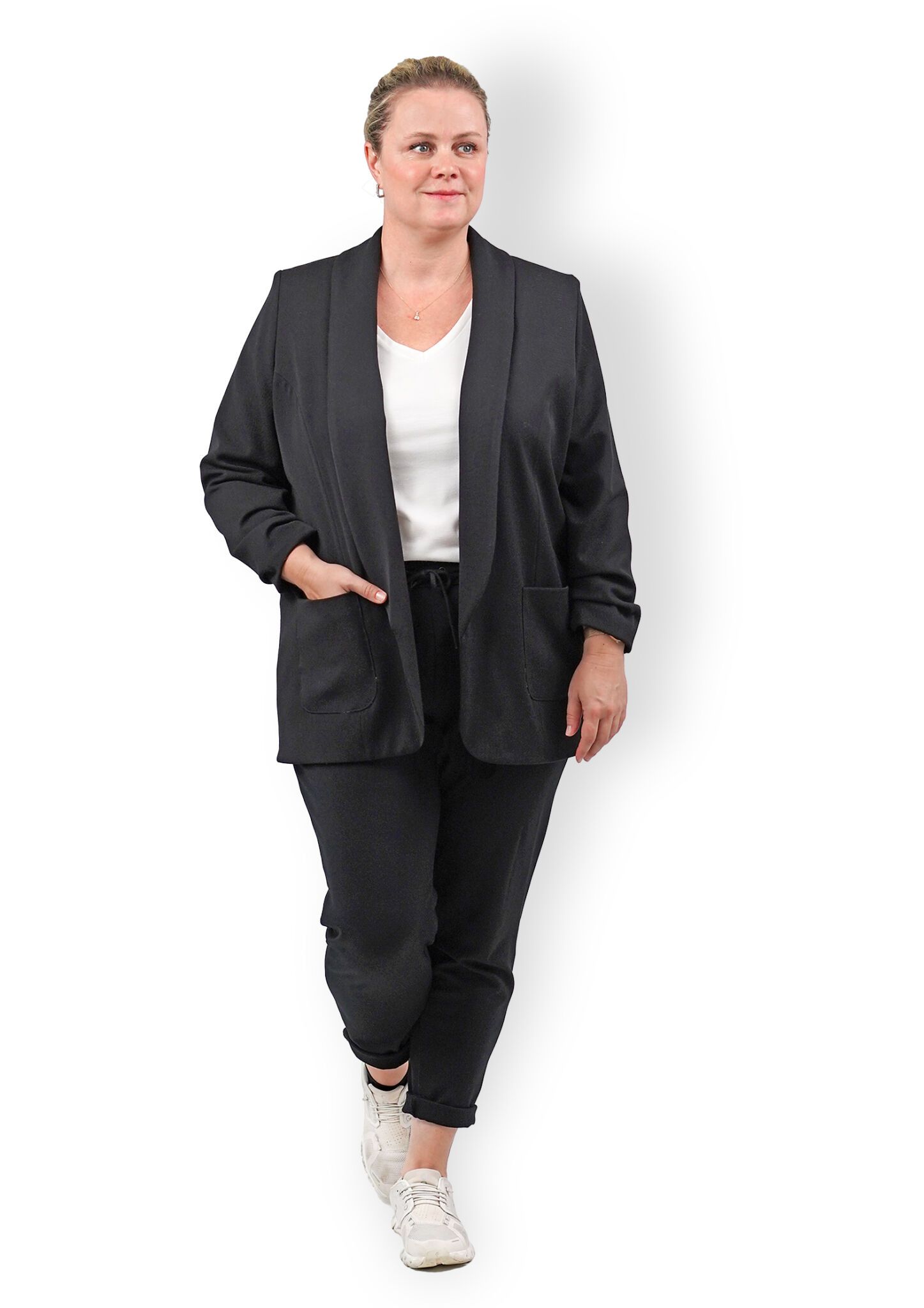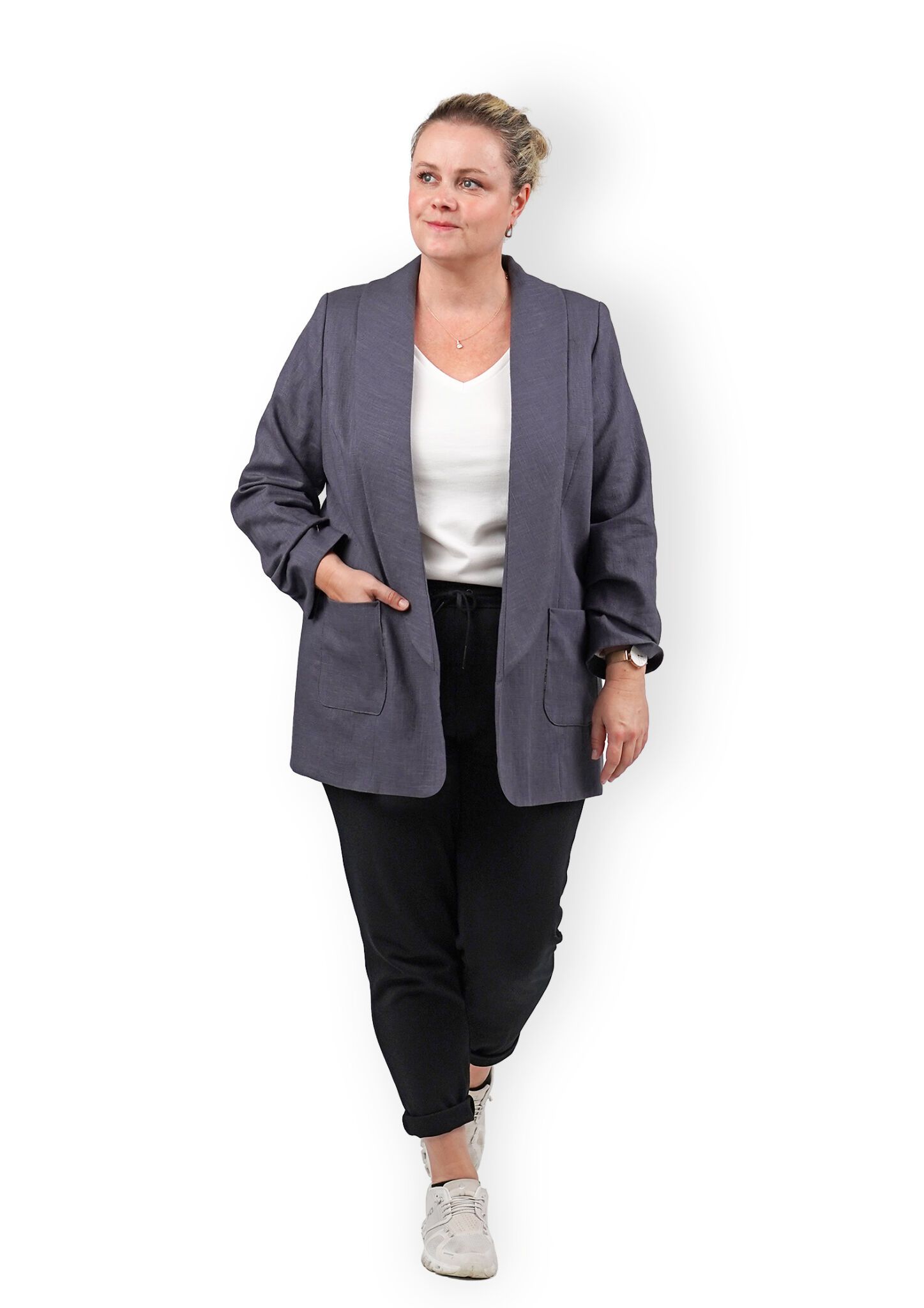 Blazeren har et længere snit og du kan sy den af french terry eller isoli alt efter årstid og lejlighed. Blazeren har praktiske påsyede lommer, der giver den et stilfuldt touch og giver plads til dine små skatte.